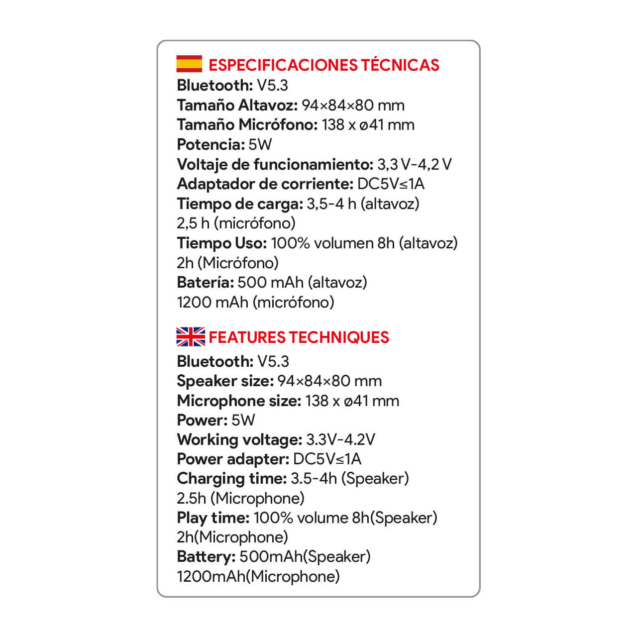 - Tiempo de carga: 3,5-4 h (altavoz) 2,5 h (micrófono)