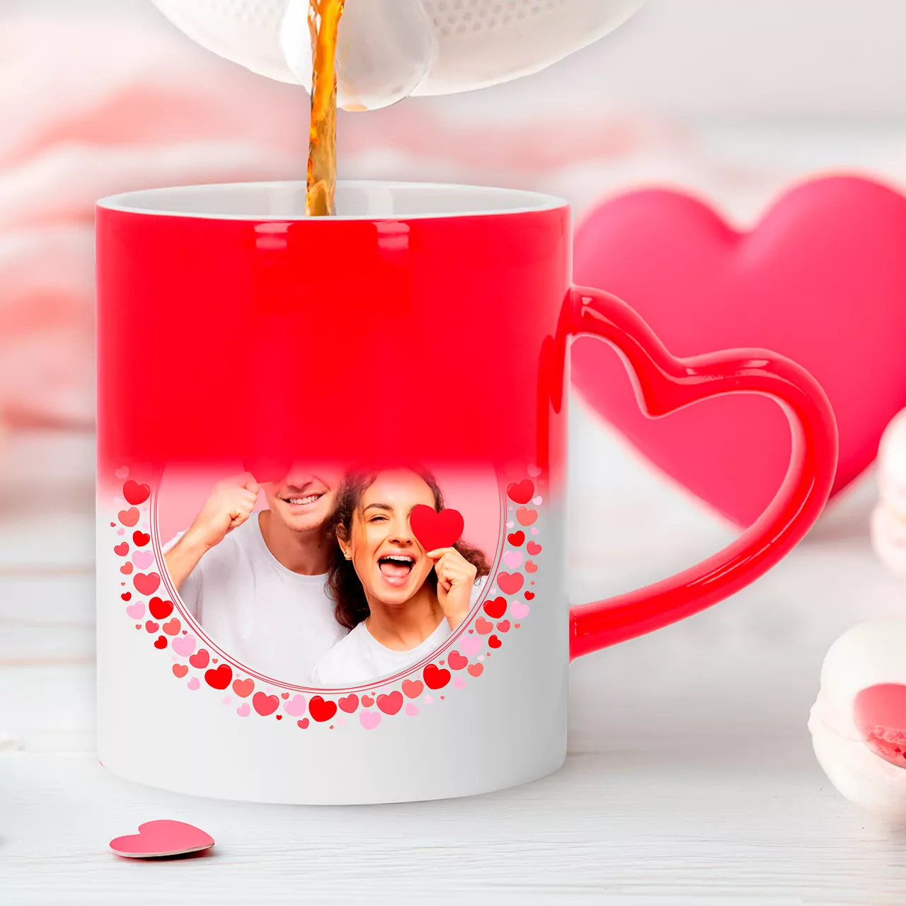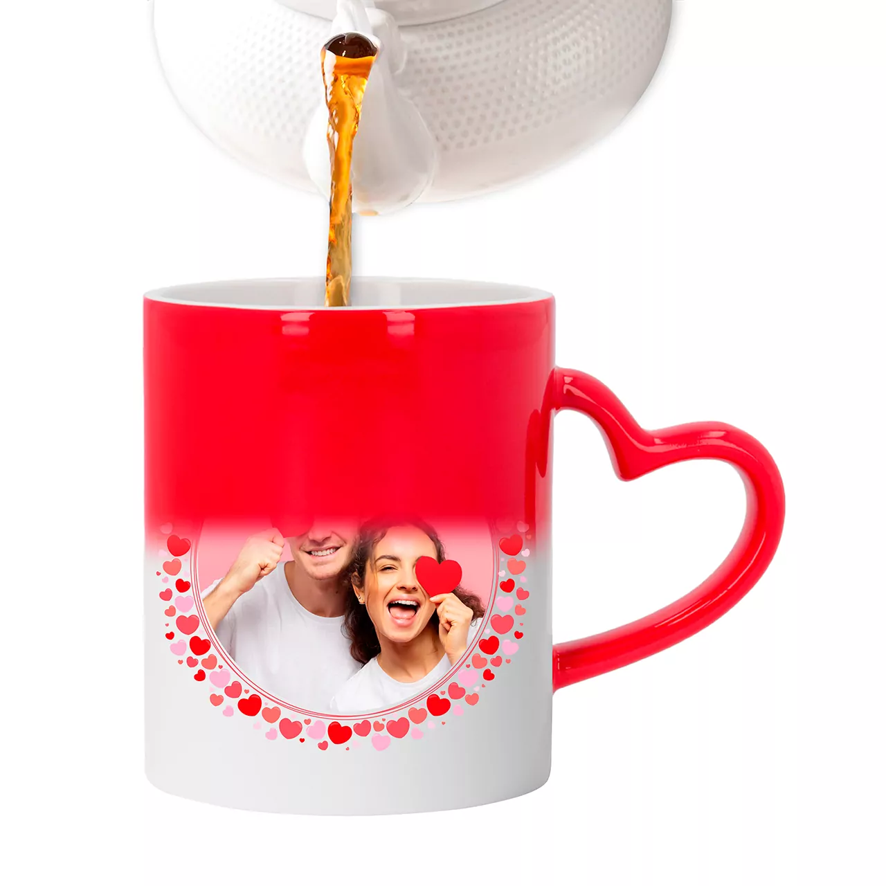 La Taza Mágica Roja con Asa de Corazón es el regalo perfecto para sorprender. La imagen o foto con la que se haya personalizado aparecerá cuando viertas un líquido caliente, creando un efecto mágico. Totalmente personalizable, con asa en forma de corazón y color rojo.