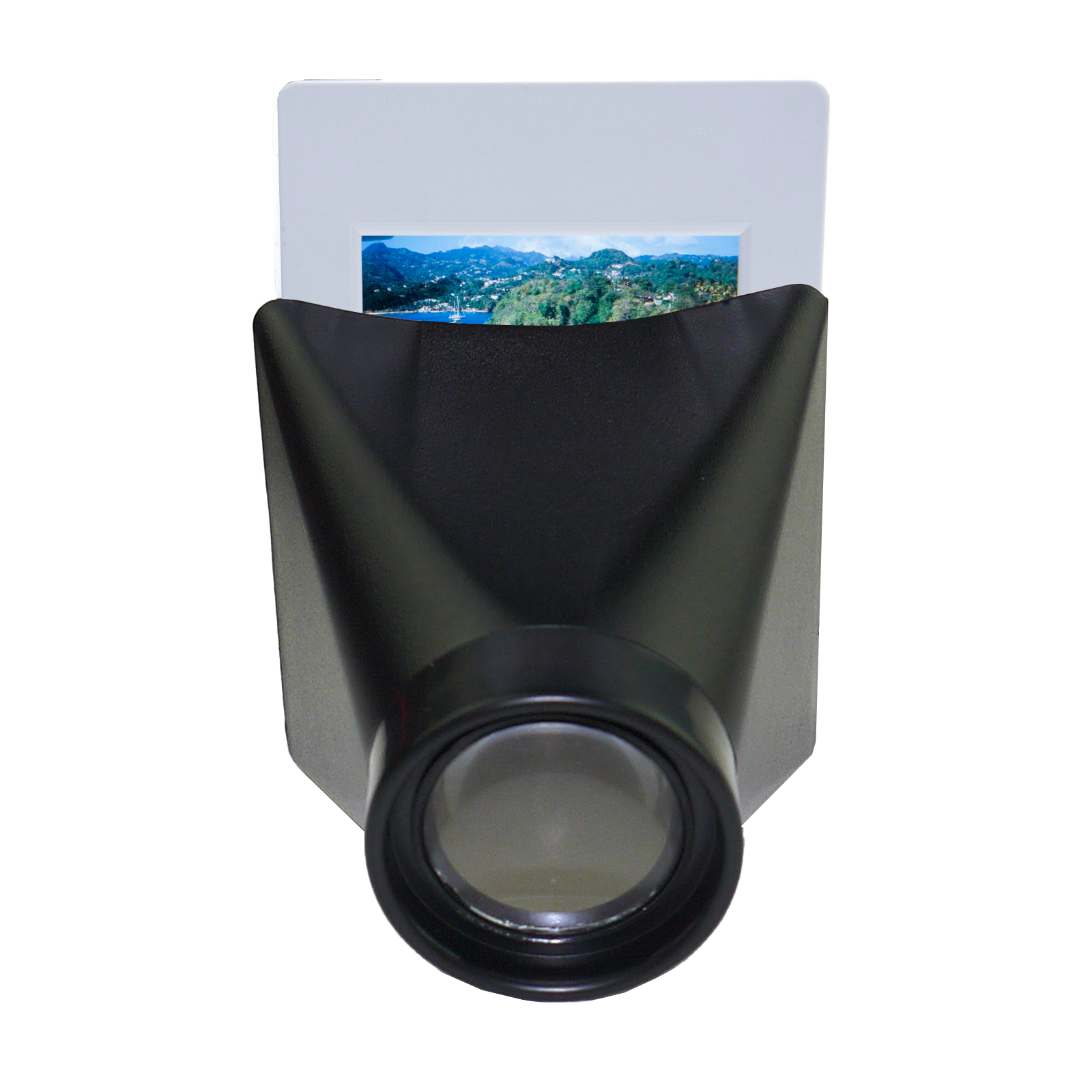 Visor para diapositivas 5×5 y bandas de negativos de 135. Lente de 2x aumentos, 20 mm de diámetro.
