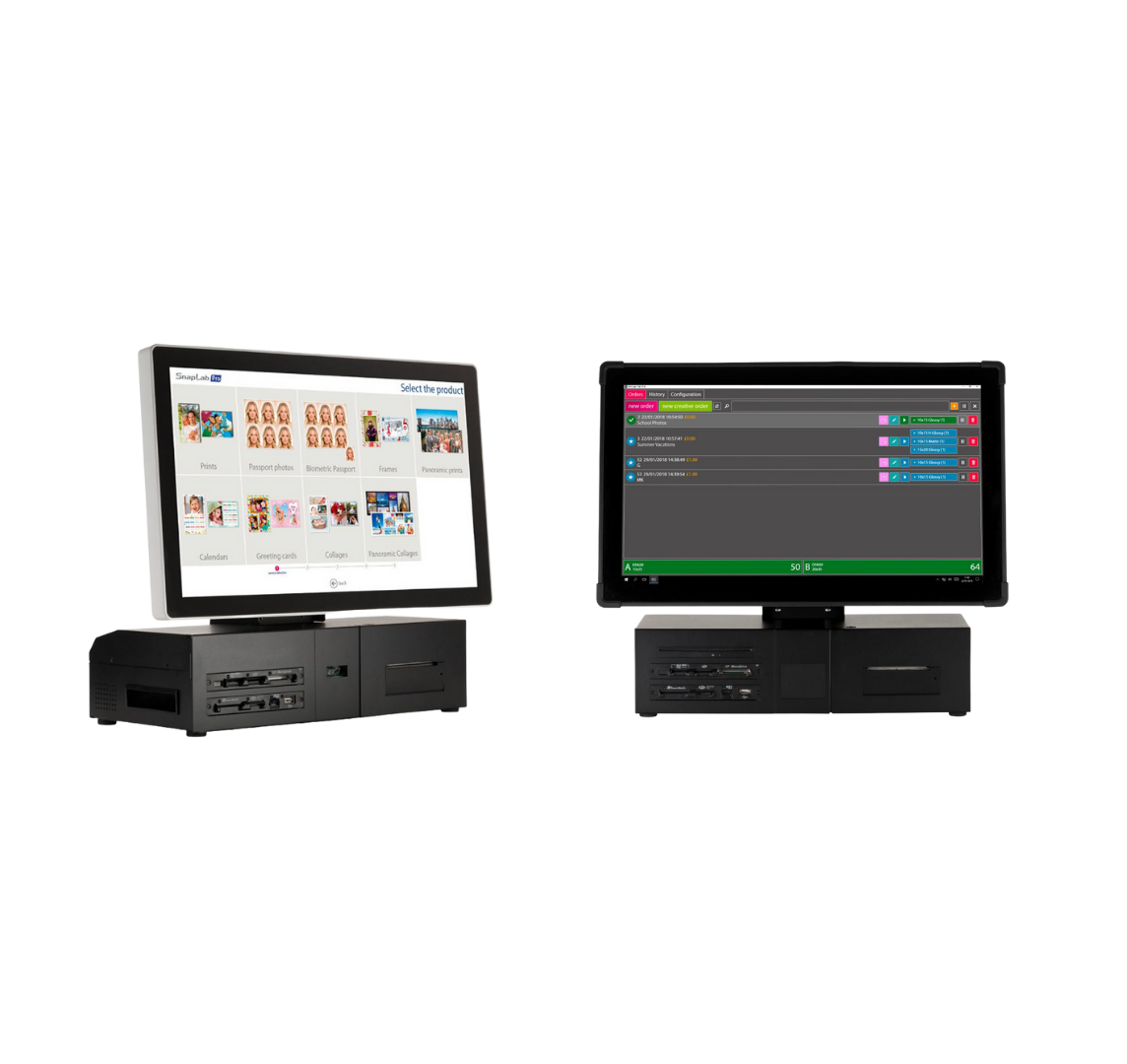A esta Central de pedidos le podremos conectar uno o varios Kioscos fotográficos DNP (Kiosco DNP SnapLab PRO) con todas las características propias de un Kiosco Fotográfico para que un cliente final cree un pedido con sus imágenes de manera autónoma o asistida, pero con una funcionalidad intuitiva, eficaz y de estética moderna.
