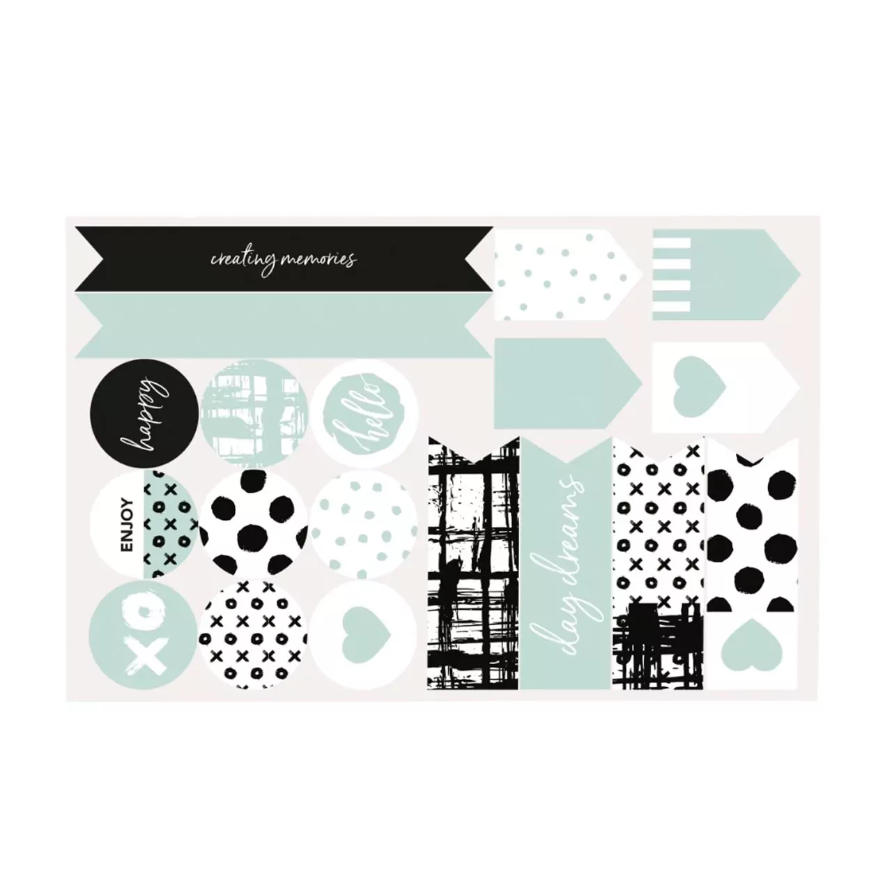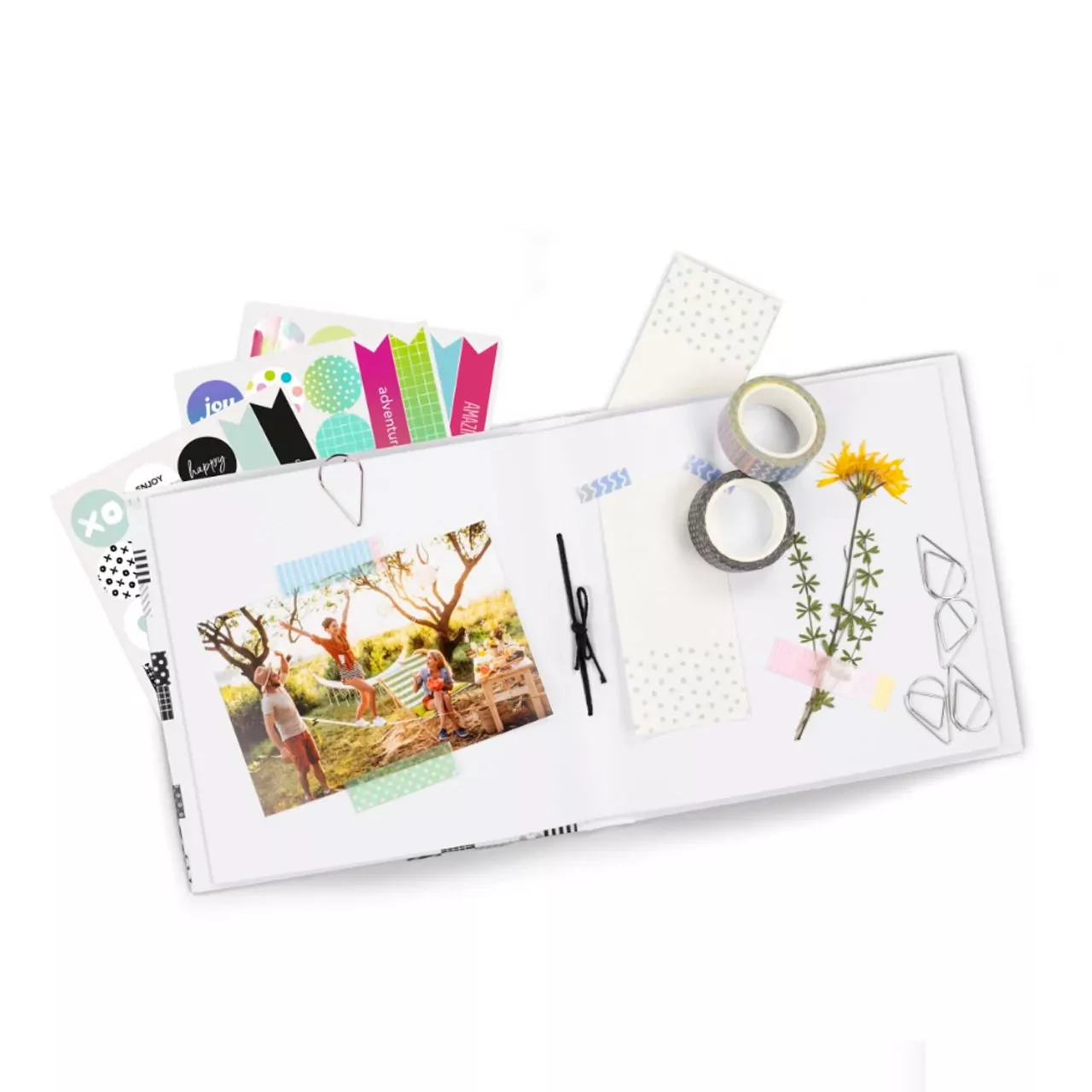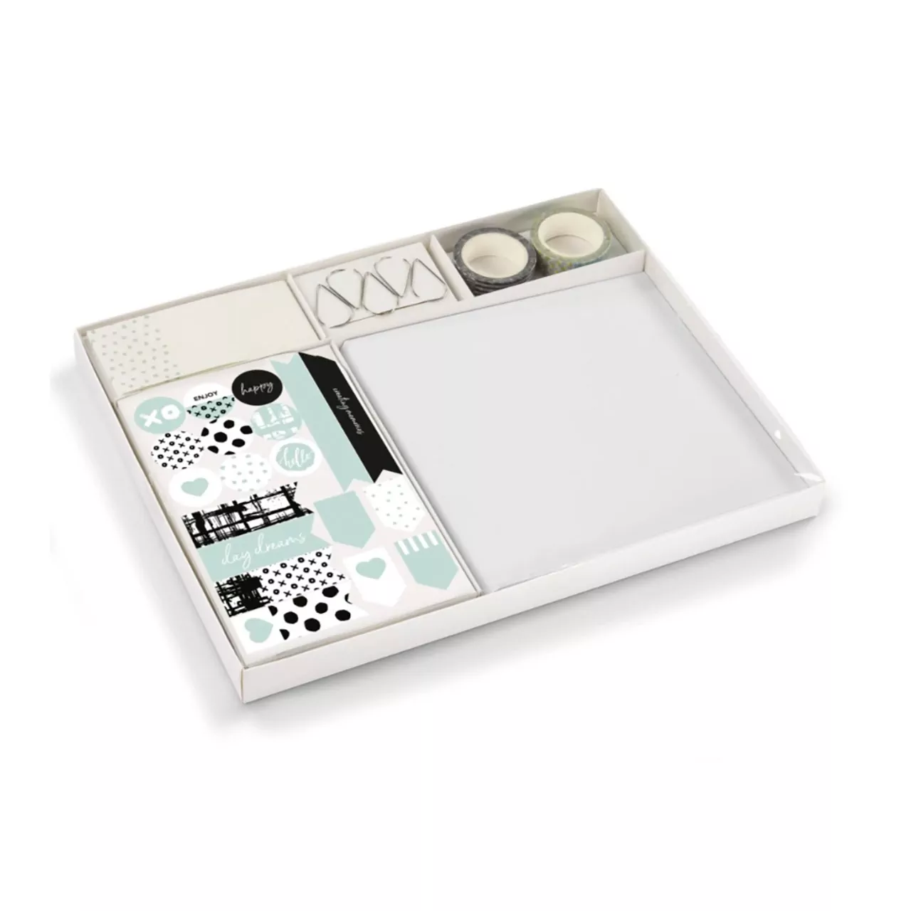 incluye 3 h. pegatinas, 1 bloc notas, 5 clips, 2 rollos cinta